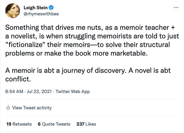 Ok, this is fascinating on many levels. I need to really ponder on this difference between memoir and novel. Structure for narrative essay or memoir has always felt so nebulous to me and I think this might unlock some things.